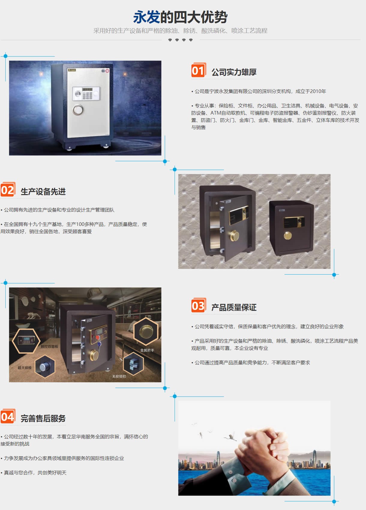 深圳永發(fā)安防產(chǎn)品有限公司 深圳永發(fā)安防產(chǎn)品有限公司,是寧波永發(fā)集團有限公司的深圳分支機構,成立于2010年,專業(yè)從事:保險柜、文件柜、辦公用品、衛(wèi)生潔具、機械設備、電氣設備、安防設備、ATM自動取款機、可編程電子防盜報警器、偽鈔鑒別報警儀、防火裝置、防盜門、防火門、金庫門、金庫、智能金庫、五金件、立體車庫的技術開發(fā)與銷售。